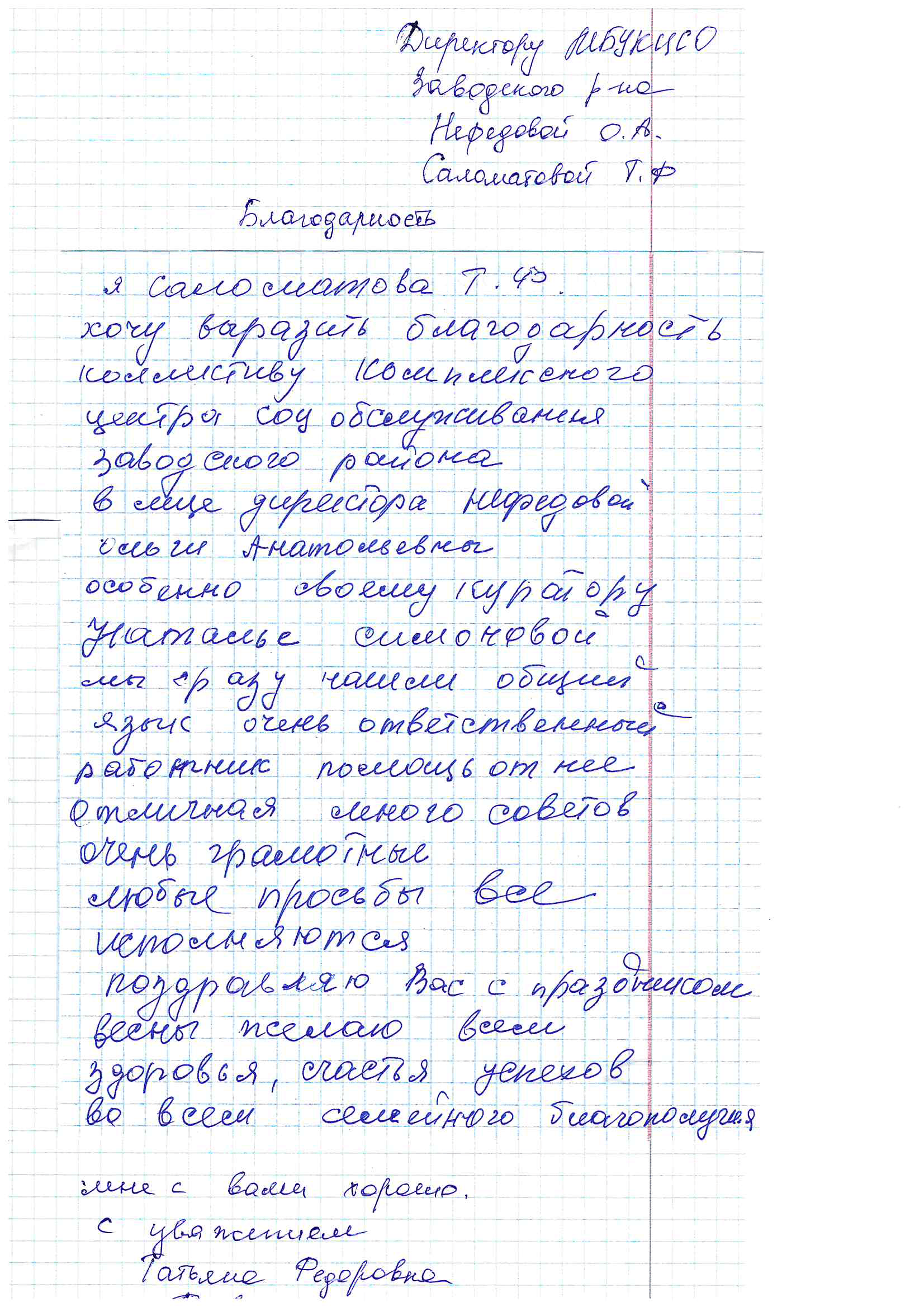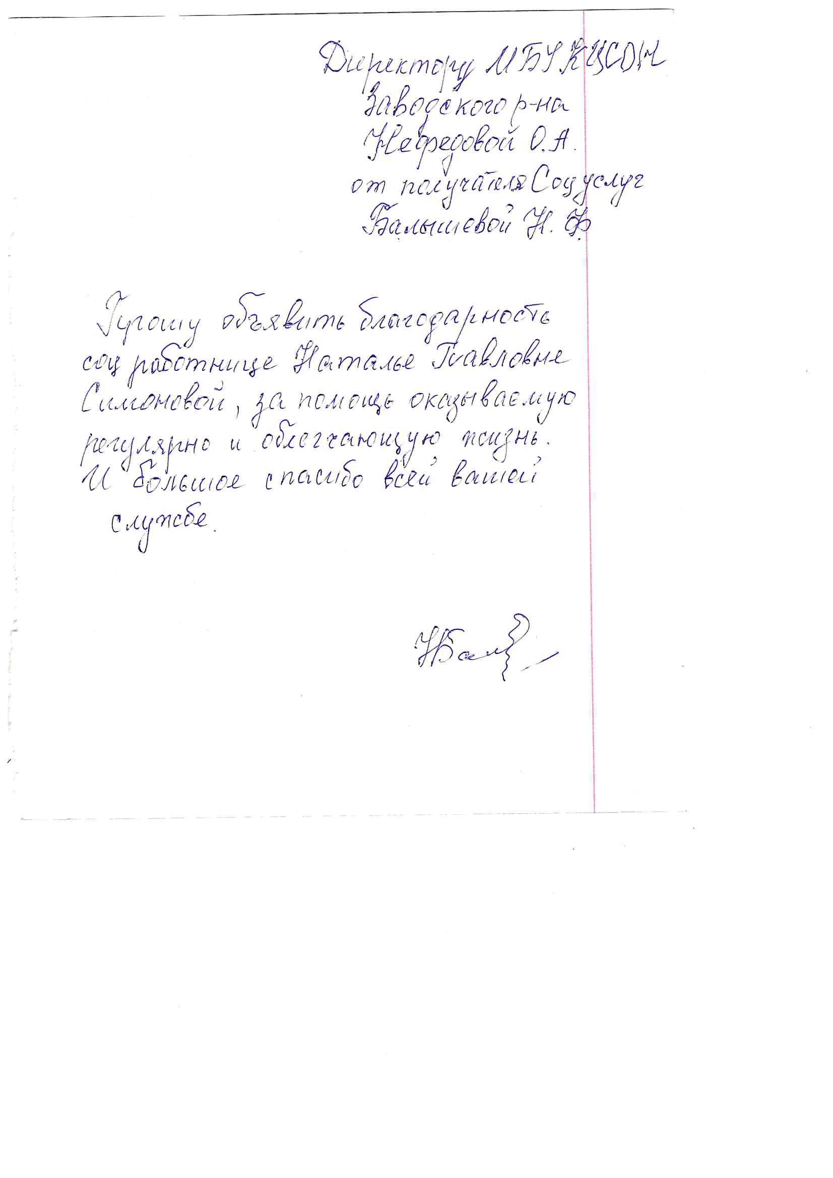 За честное, добросовестное и качественное обслуживание, чуткое отношение к людям, сердечную теплоту выражает свою благодарность инвалид детства Кириллова Надежда Васильевна заведующему отделением и социальным работникам Ильиной Наталье Павловне, Чашниковой Яне Сергеевне. Надежда Васильевна инвалид с детства, одинокая, состоит на социальном обслуживании на дому с апреля 1992 года.